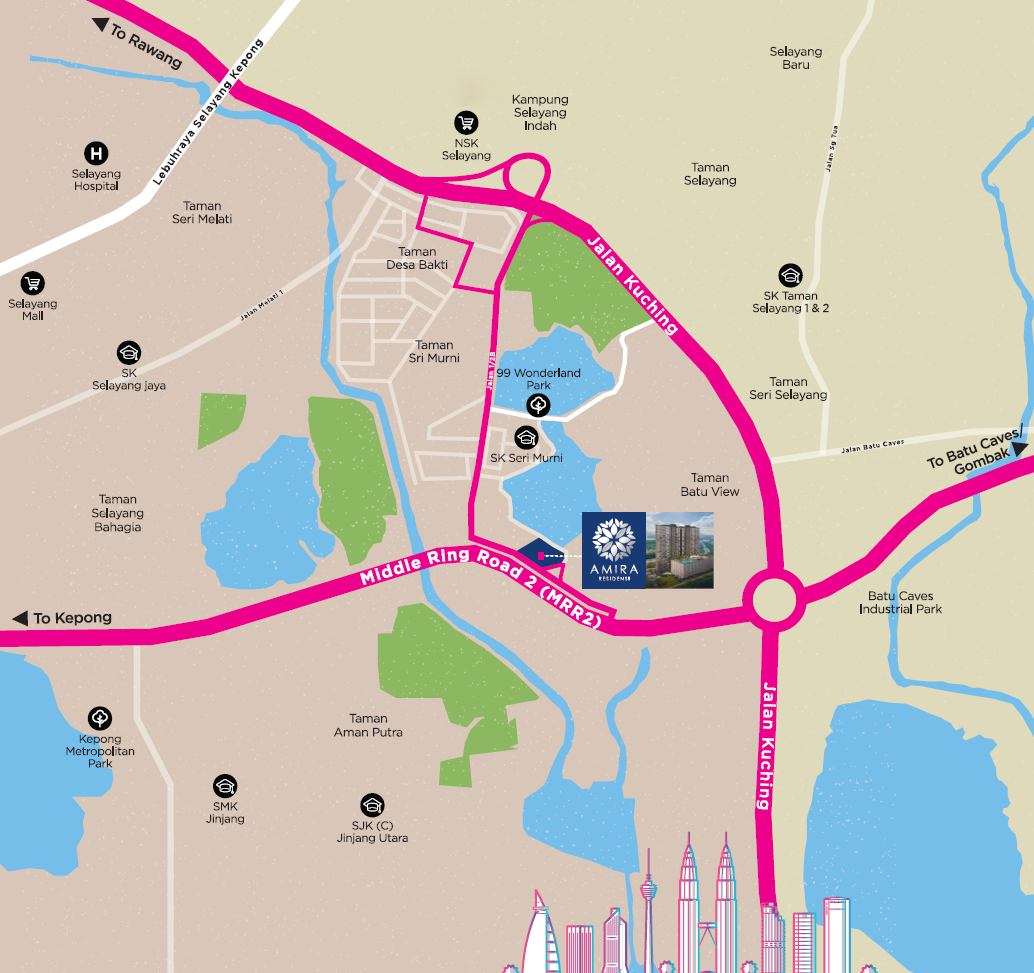 Located along MRR2, Amira Residensi is surrounded by matured neighbourhood with complete amenities like malls, hospitals, local and international schools– and with the KLCC just a 20 minutes apart.